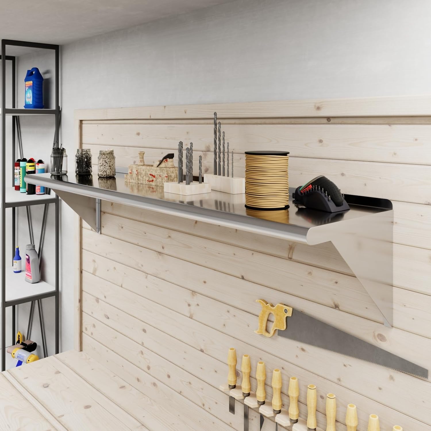 - Its professional, modern and sleek design makes this metal floating shelf perfect for use in any residential or commercial kitchen, food truck, garage, closet, laundry room, utility and equipment room, lab, appliance shelf for toaster and microwave, etc.