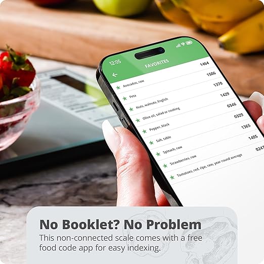 - Preloaded with nutrition data for 2,000 foods, plus space for 99 custom entries. Note: This is a standalone scale and does not sync with any devices. A free companion app is available for food code lookup only (not for logging or tracking).