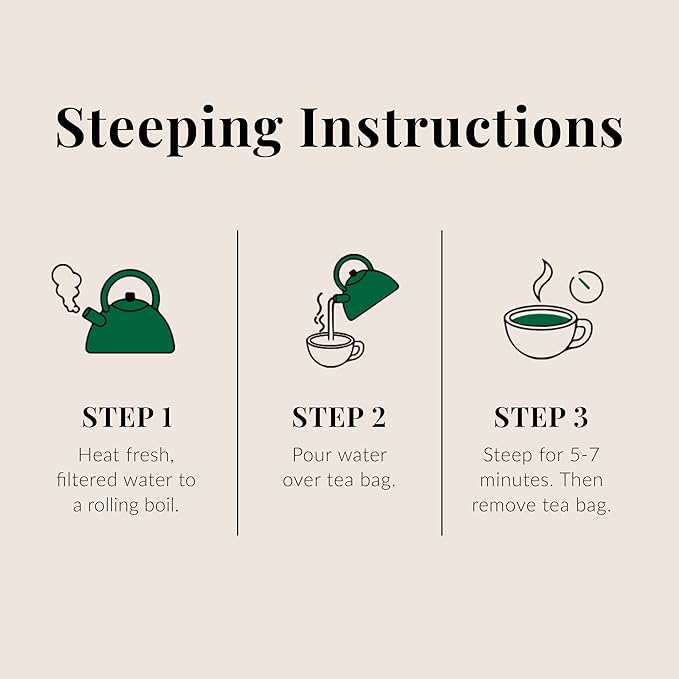 - STEEPING INSTRUCTIONS: Simply heat fresh, filtered water to a rolling boil. Then pour 6 oz of water over tea and steep for 5-7 minutes. After steeping, add the used tea bags to compost or soil — they make gardens happy.