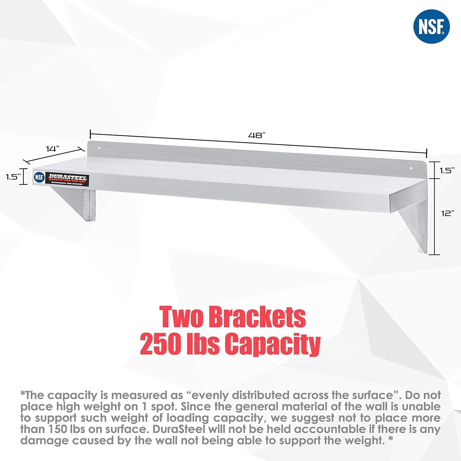 DuraSteel Heavy Duty Wall Mount Shelf - 48" Wide x 14" Deep Classic Stainless Steel Wall Floating Shelves - NSF Metal Storage Wall Shelves - For Commercial Kitchen, Laundry Room, Garage, Food Truck
