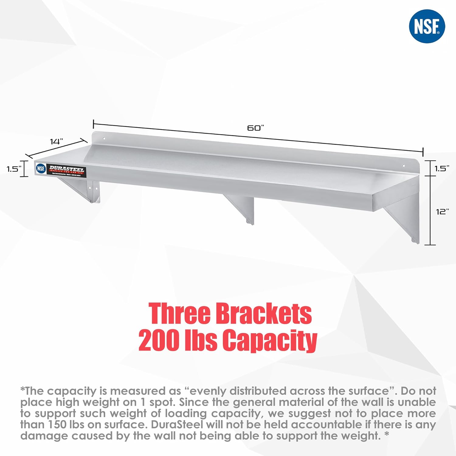 DuraSteel Stainless Steel Wall Mount Shelf 60" Wide x 14" Deep Commercial Grade - NSF Certified - Good for Restaurant, Bar, Home, Kitchen, Laundry, Garage and Utility Room