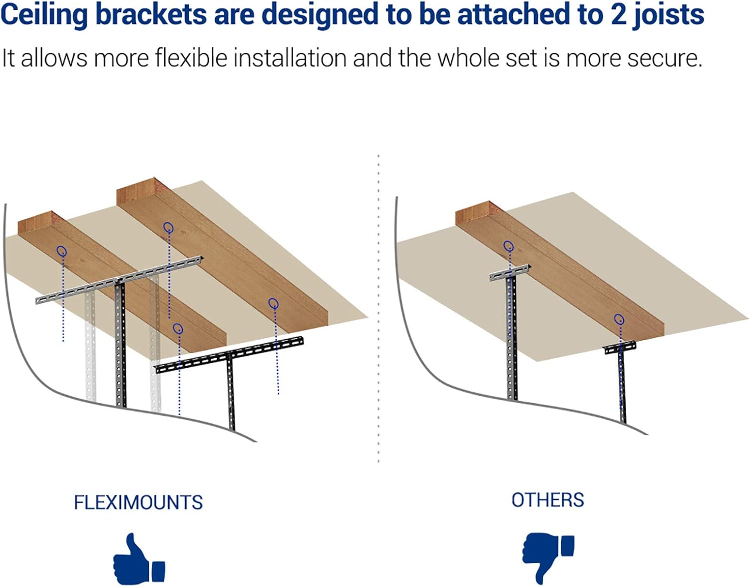 - STABILITY & SAFETY-With our specially designed longer ceiling brackets that attach to two joists, FLEXIMOUNTS overhead garage storage racks are more stable and secure compared to others!