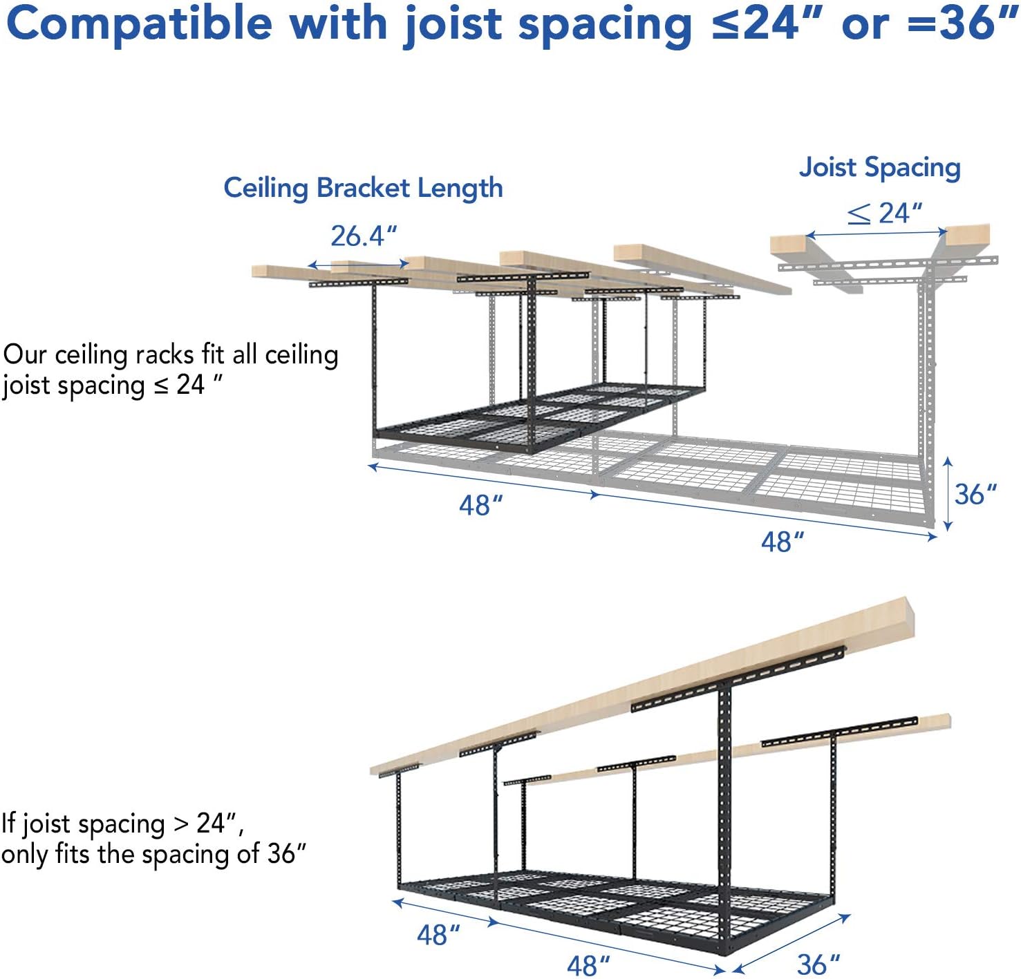 - DIY INSTALLATION:Installation template helps make plan.This overhead storage rack fits all ceiling joist spacing≤24",if joist spacing>24",only fits the ceiling spacing of 36".
