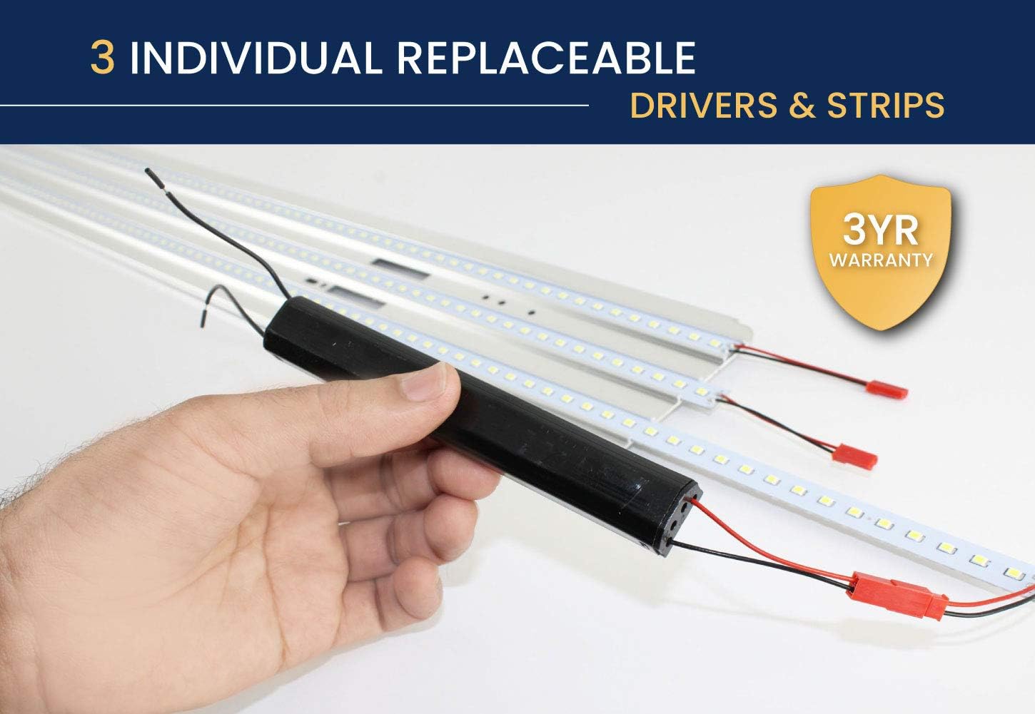 - Vibrant & Bright: Enjoy 8000 Lumens of crisp, daylight white light (6500K) with replaceable LED strips and drivers. Instantly experience energy savings and improved visibility. Lightly frosted lens cover for optimal light distribution.