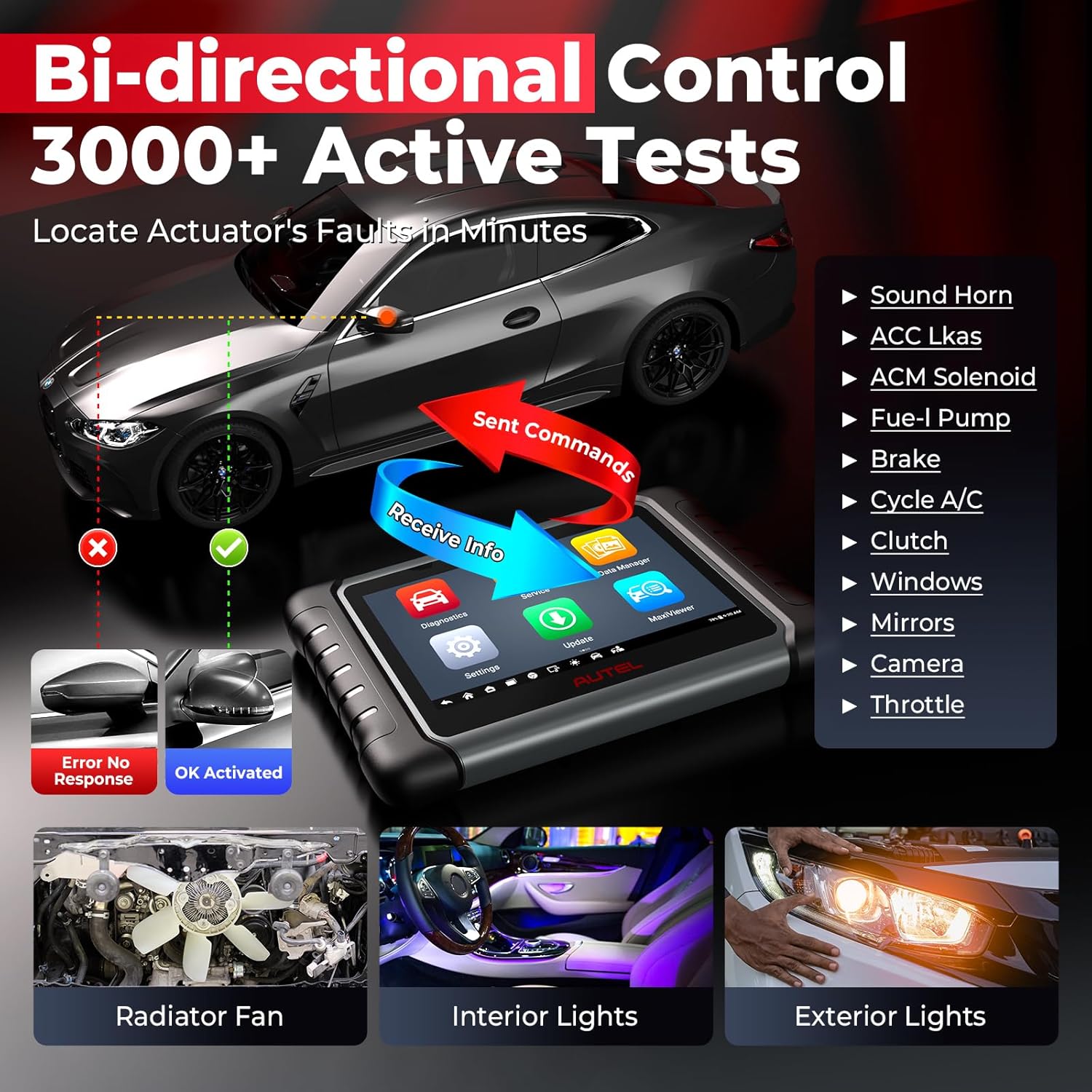 - 🚘【Full Bi-Directional Control, 3000+ Active Tests】Full Update 2.0, from 50+ tests to 3000+ tests, Upgrade of Autel scanners MaxiCOM MK900-BT MK900 MX900 MX808S, Autel MP808S bi-directional scan tool can command ECUS & monitor the operation of the actuators to quickly locate the car issue, perfect for daily inspection and damage location, save time and money, such as turn feul pump on/off, cycling A/C Clutch, windows, sunroof, wipers, etc. Note: It is necessary to check compatibility via 📞autelsevice@ outlook .com📞 before ordering.