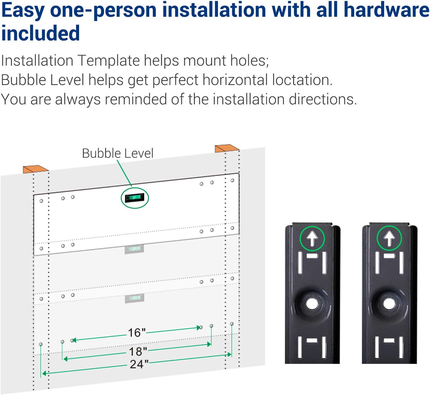 - Easy to Assemble: Easy one-person installation with all hardware included: Installation Template helps mount holes; Bubble Level helps get perfect horizontal loctation; You are always reminded of the installation directions.