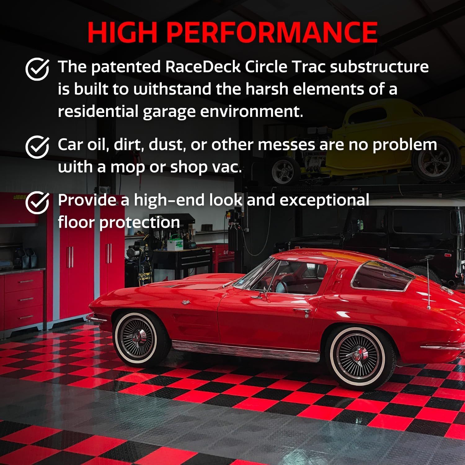 - QUICK AND EASY INSTALLATION: RaceDeck CircleTrac garage flooring is easy to install. The interlocking tiles simply snap together β no tools, glues, or extra hands required. These high impact tiles are quick to install and built to last!