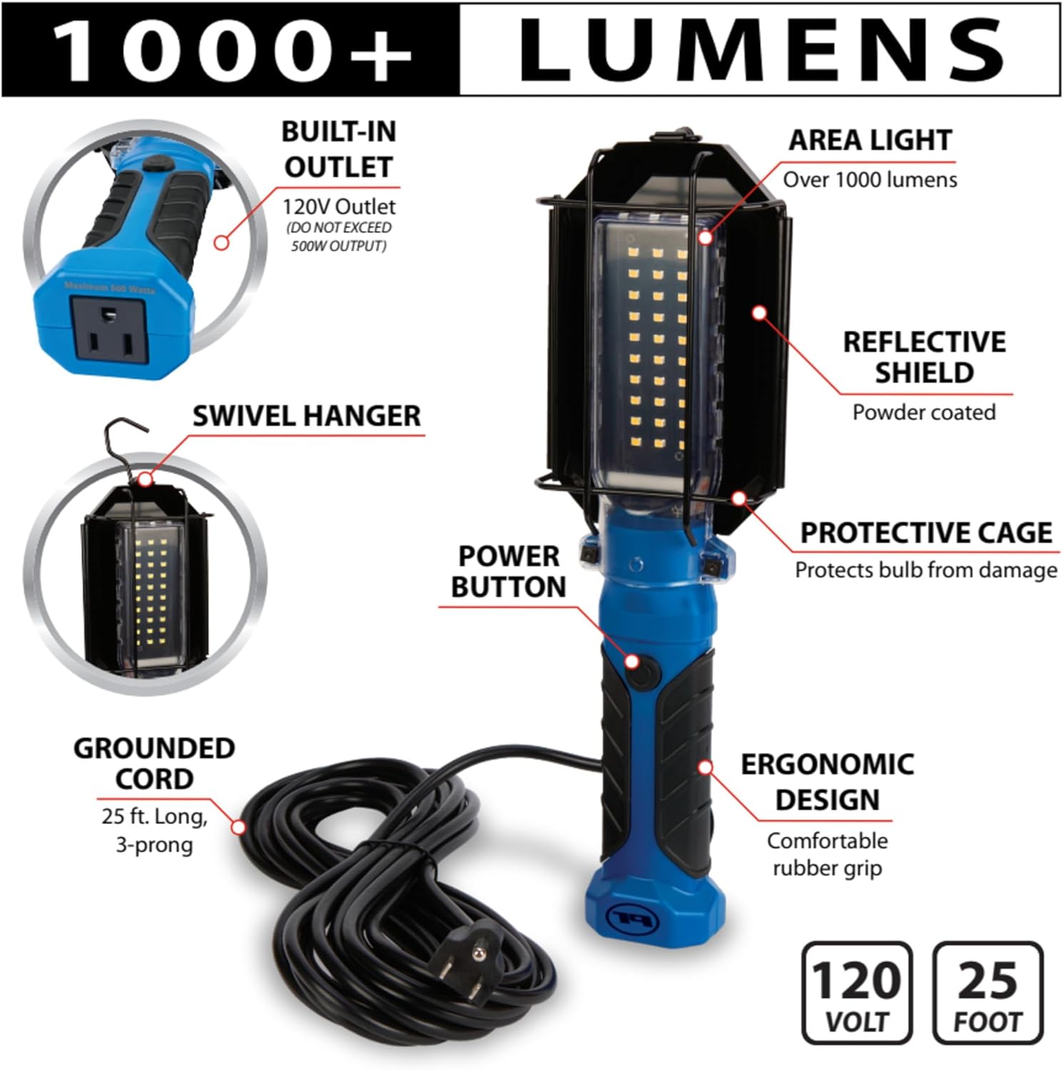 - 1,000 Lumen 25ft 18GA grounded cord with built-in 120V outlet (600W MAX)
