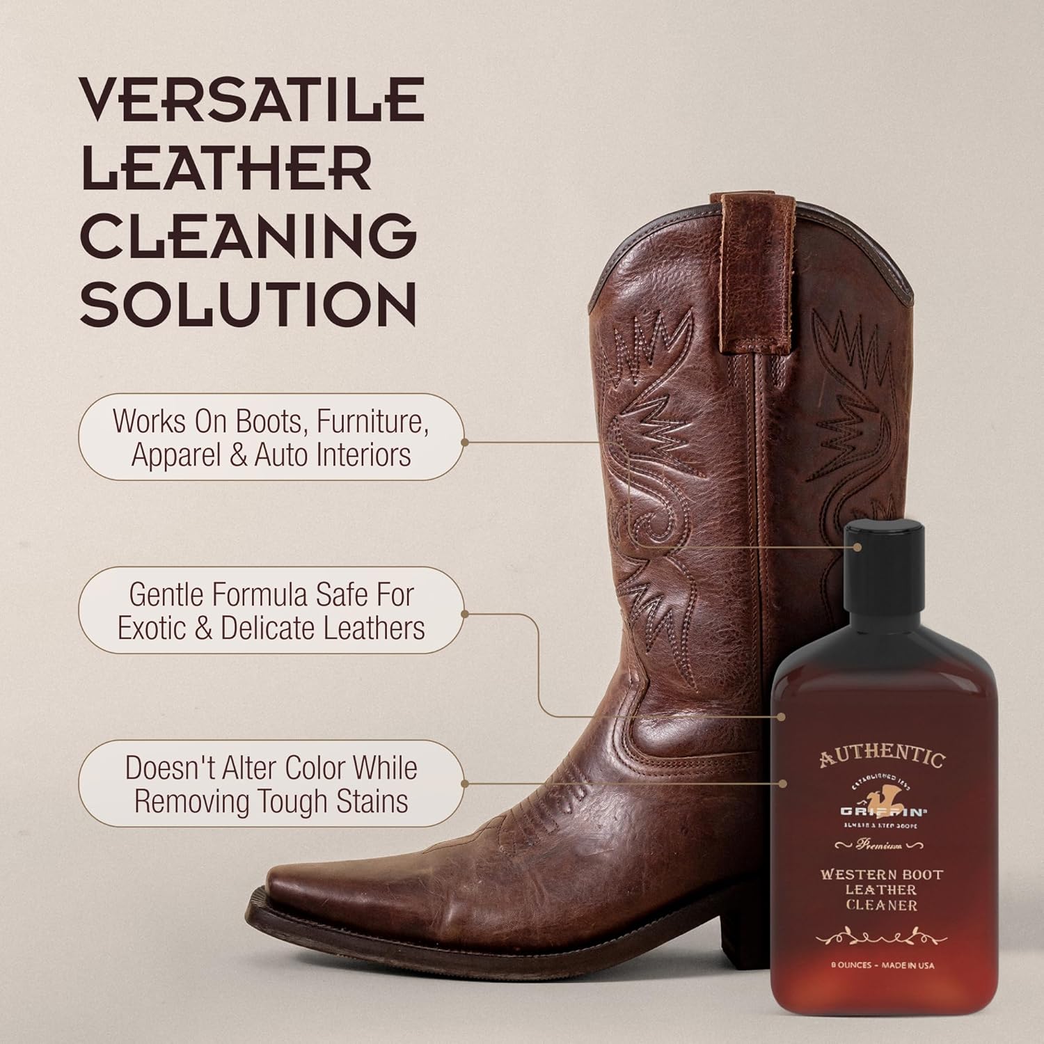 Griffin Boot Care Leather Cleaner – 8 oz – Gently Cleans Footwear, Apparel & Interiors – Non-Toxic, Non-Darkening, Made in USA – Leather Cleaner for Cowboy Boots, Furniture, Cars & More