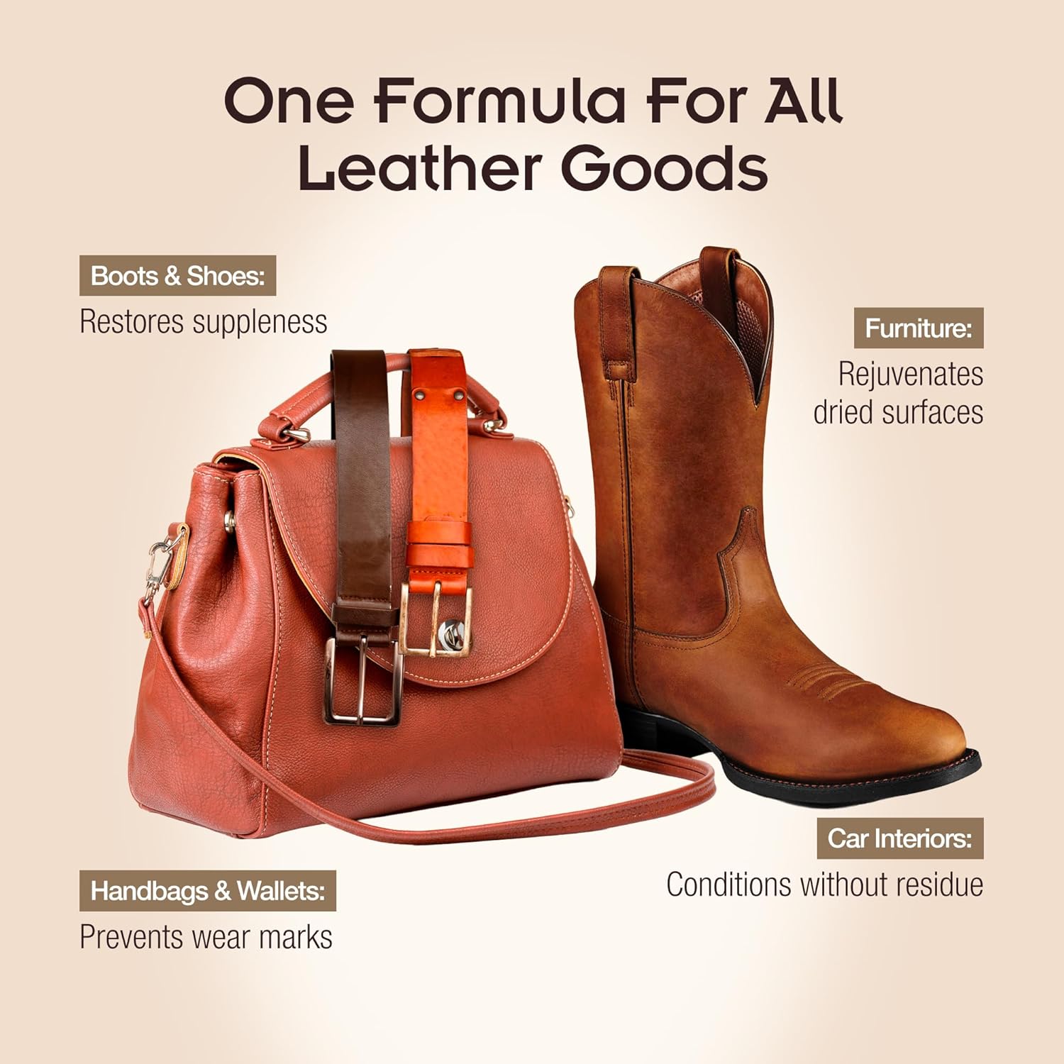 - VERSATILE FOR MULTIPLE SURFACES – Whether you need a leather cleaner for boots, a leather bag cleaner, or a car leather stain remover, this all-in-one solution refreshes leather goods of all types, including furniture, auto interiors, and apparel.