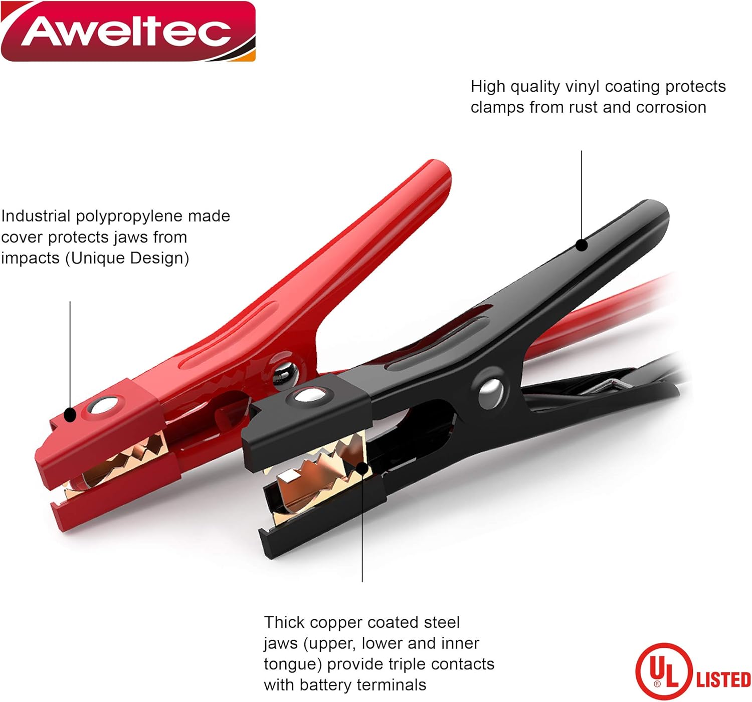 - Unique Design Strong Clamps - Industrial polypropylene made cover protects jaws from impacts (Unique Design), Also patented design clamps covered with non-conducting rubber, which make AWELTEC jumper cables more safe and durable for repeatedly use.