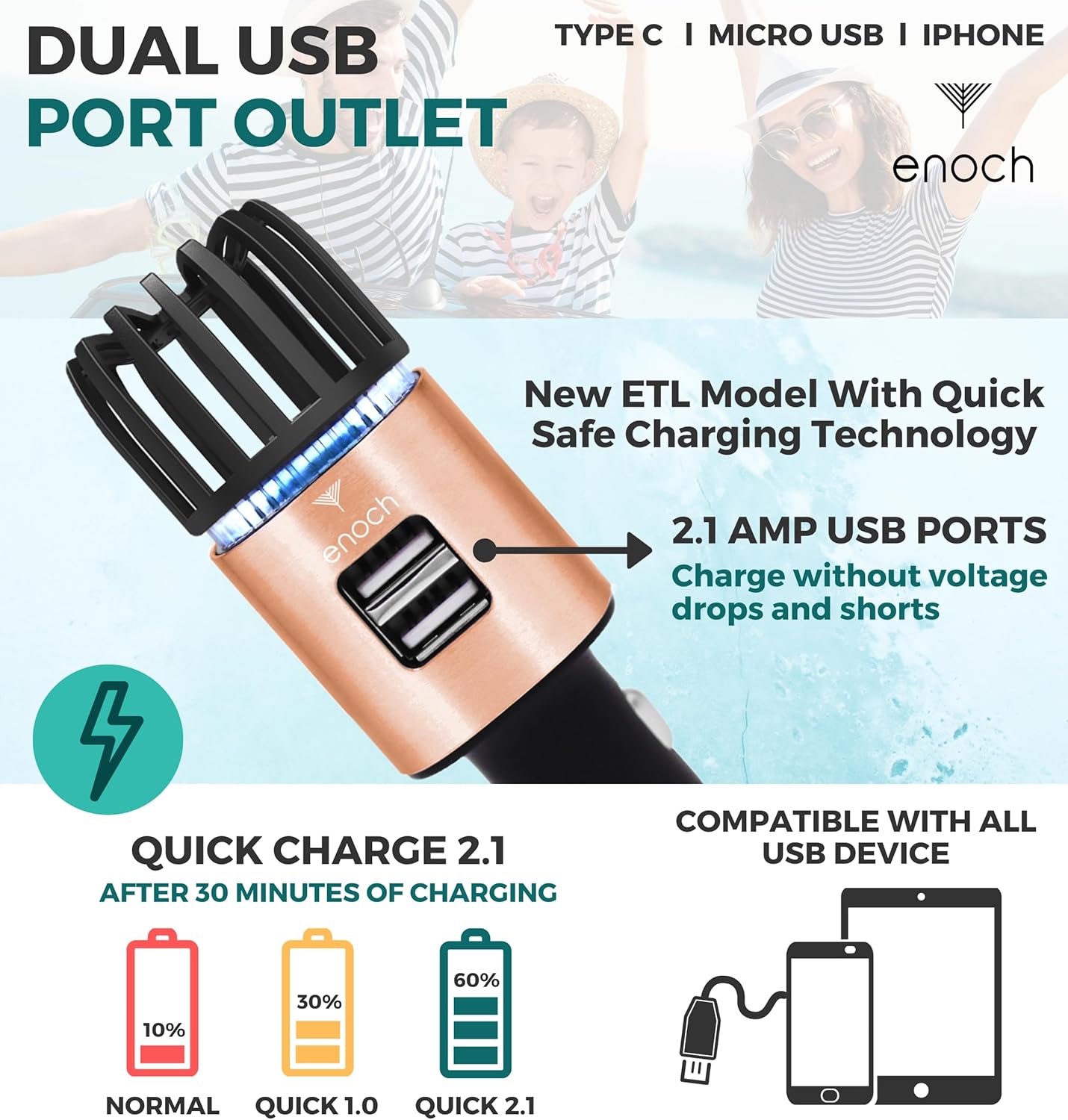 Enoch Car Air Purifier Premium Air Ionizer - 12V Plug-In Ionic Ozone Deodorizer Accessory with Dual USB Car Charger - Eliminates Cigarette Smoke, Pet and Food Odors, Dust (Rose Gold)