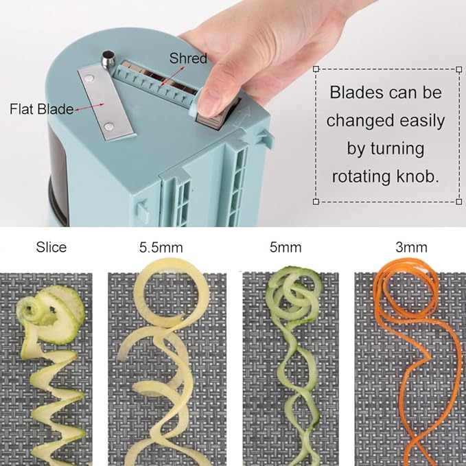 - Space Save Spiral Vegetable Cutter: one knob control 4 blades, there is no headache about storage blades and install blades. You can quickly choose the blades you want, and it will save you much time.