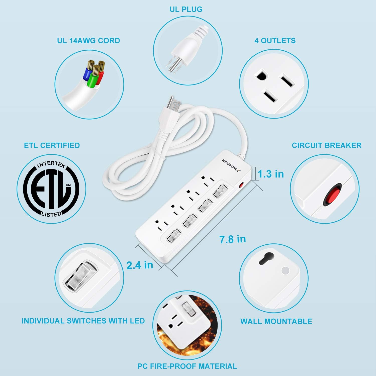 - 【Convenient Individual on off Switches】ROOTOMA 4 AC Outlet 6ft Surge Protector power strip has 4 separate switches. It can individually control your appliances, saving energy when not in use. Independent switches provide a great flexibility in areas where plugging and un-plugging power cords would be a hassle.