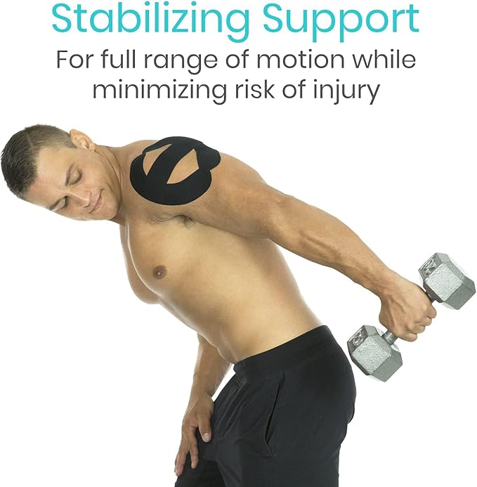 - STABILIZING SUPPORT FOR ANY ACTIVITY: Allowing a full range of motion, the Vive kinesiology tape provides targeted support to sore muscles and weak joints. The sports tape stabilizes joints and muscles to relieve pain and minimize the risk of injury during workouts, sporting events and daily activities. Ideal for running, weight lifting, crossfit and yoga, applying sports tape helps to relieve knee pain, shin splints, plantar fasciitis, shoulder pain, carpal tunnel and more.