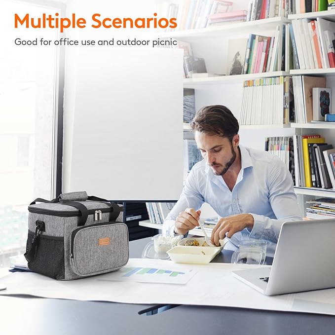 - Convenient & Portable: The lid of this cooler lunch bag can be opened up widely with strong two-way zippers, which means you can put your lunch container into the bag and take out of the bag vertically. Prevent liquids from leaking out of the container and soiling inside the bag. Tough handles and shoulder girdle allows you to carry it easily. Moreover, the front and side extra pocket can hold small items like keys and earbuds