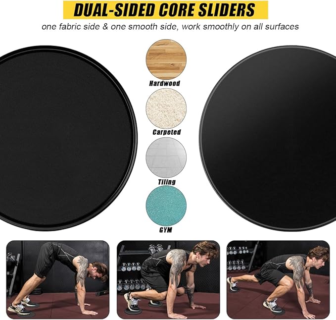- Double Sided Sliders: 2 fitness core sliders work smoothly on all surfaces so that you won’t matter what surface you’ve got. Double Sided, one is fabric side and the other is smooth side, it ensures you slide easily and keep your feet stay in place. The discs are total body workout that is very low impact but highly effective for building core strength, gives you an intense abdominal and entire body workout.