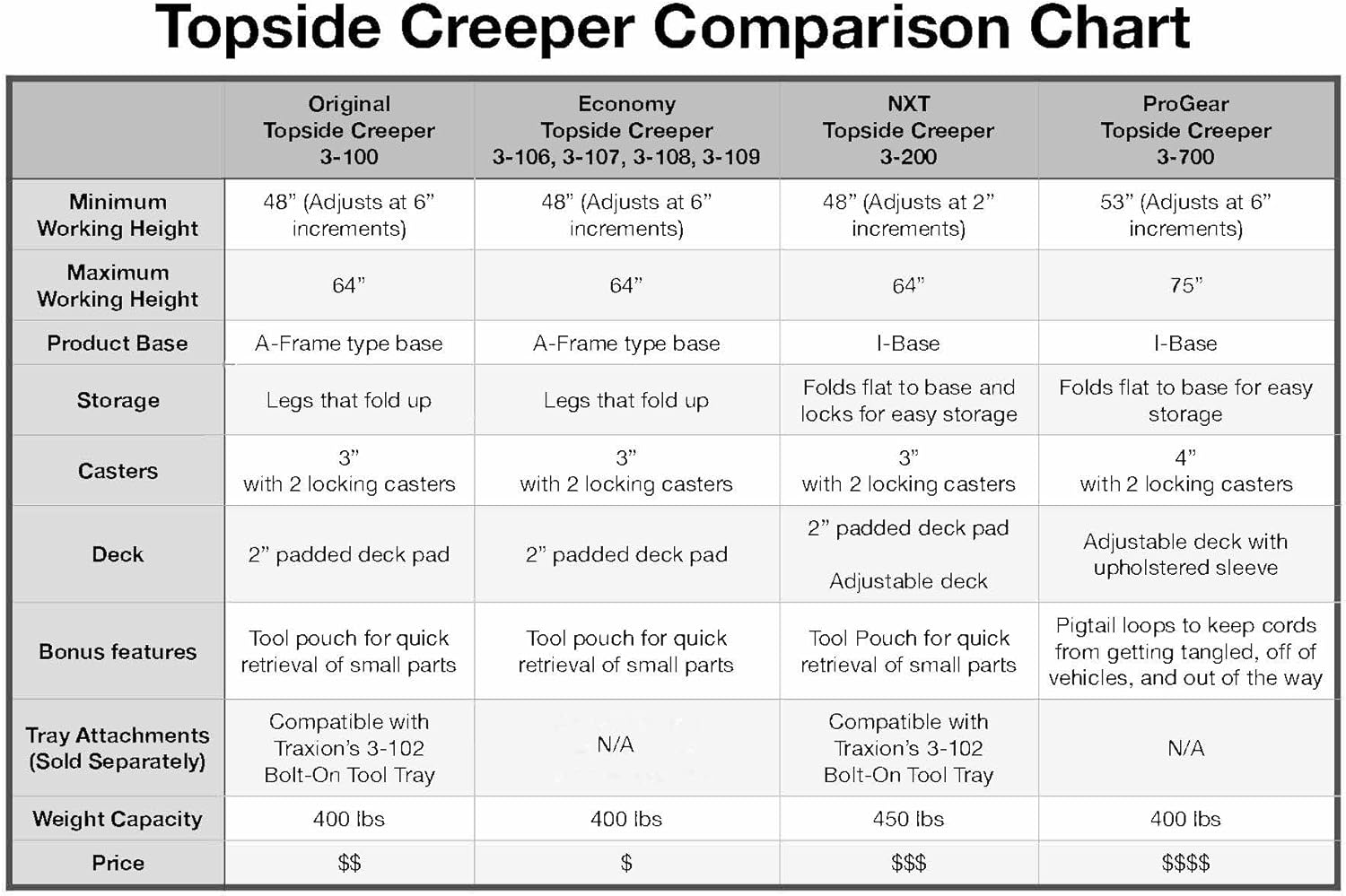 - Fits on the 3-100 Original TraxionTopside Creeper & the 3-200 Topside Creeper NXT