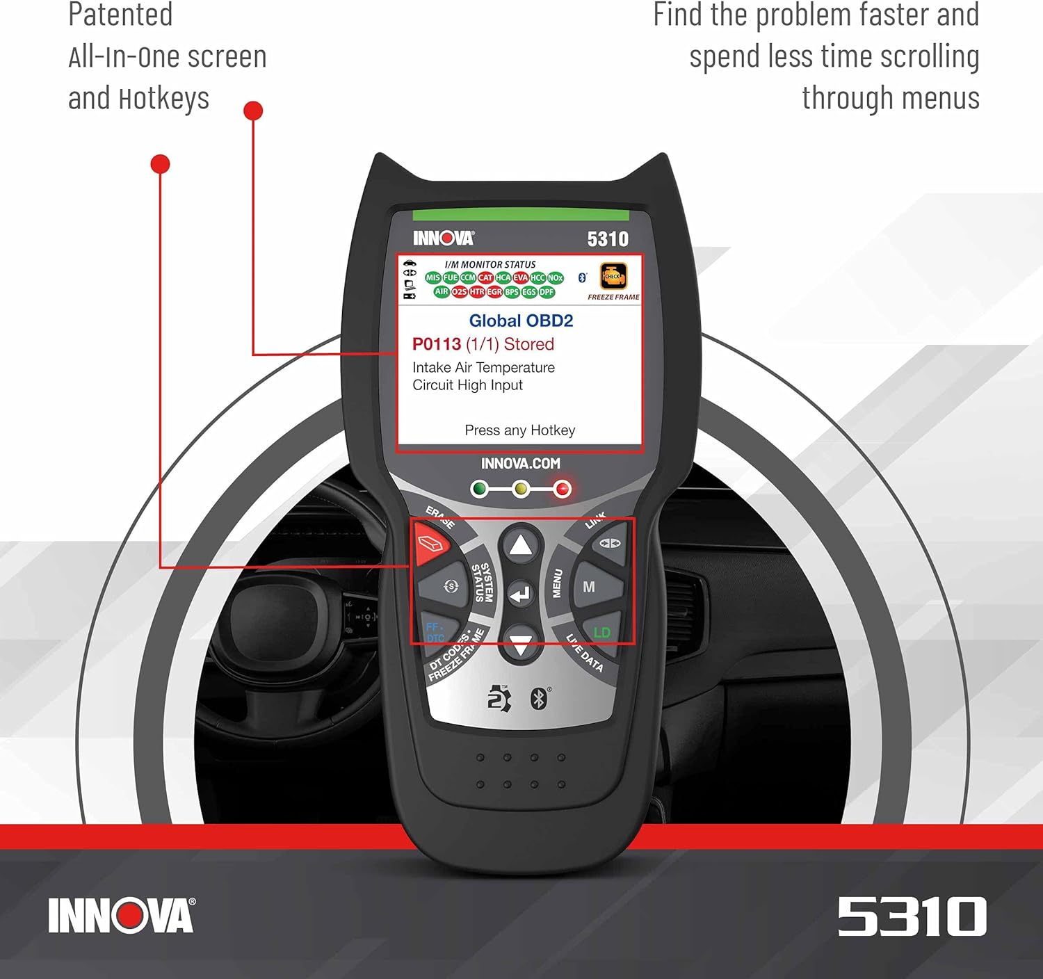- MAINTAIN PEAK PERFORMANCE AND SAFETY ON THE ROAD - The 5310 OBD2 scanner diagnostic tool helps you quickly find and fix vehicle problems. Use the mobile scanner for car with the OBD2 Bluetooth application RepairSolutions2, trusted by 4M users, available on App Store or Google Play, for real-time solutions. With this car scanner, access verified fixes, purchase exact repair parts, view maintenance schedules, and explore Innova’s wireless code readers & scan tools database.