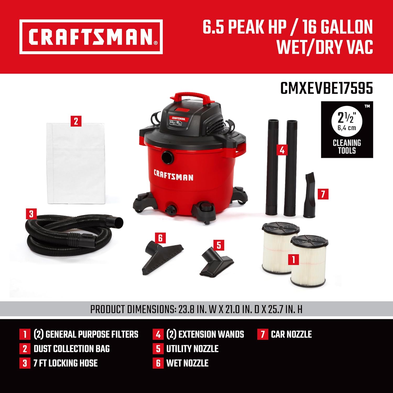 CRAFTSMAN CMXEVBE17595 16 Gallon 6.5 Peak HP Wet/Dry Vac, Heavy-Duty Shop Vacuum with Attachments and Additional General Purpose Filter