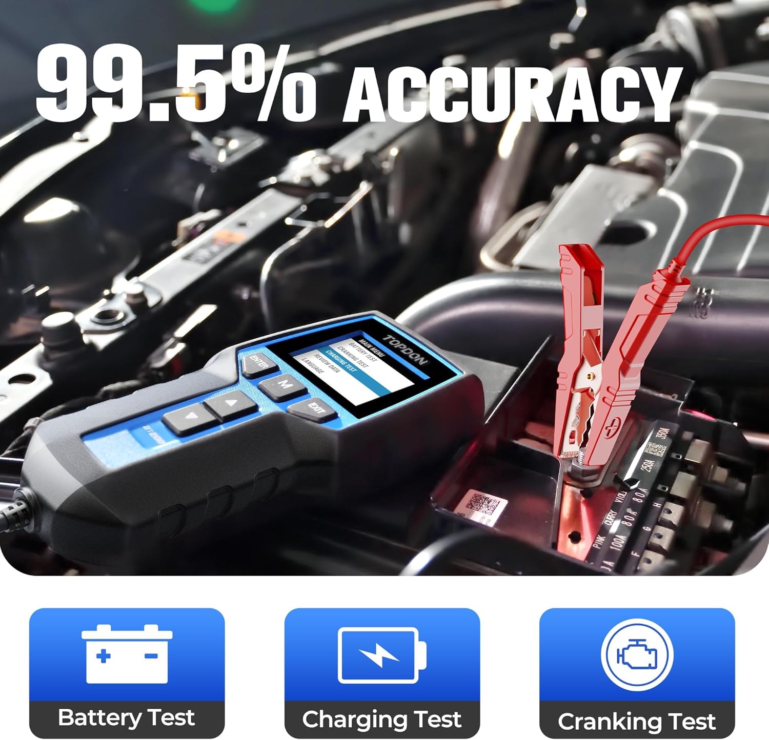 - A Must Tool For DIYers & PROS: TOPDON BT200 battery tester is an upgraded version of the BT100, AB101 and BT20. Applying the advanced conductance testing technology, it can give you accurate testing results in seconds. Fit in your glove box, it's a handy device for automobile factory, garage, auto battery manufacturer, and DIYer