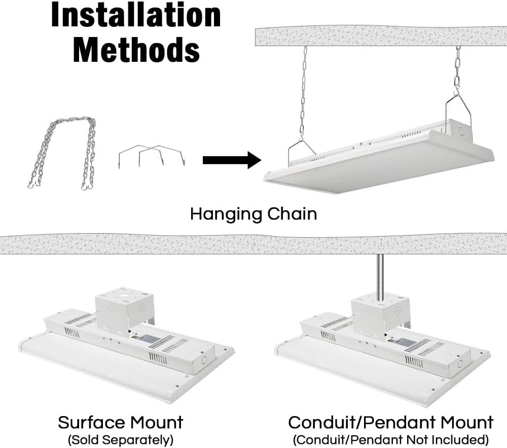 - 💡 Easy Installation - No Bulbs and No Maintenance Ever! Plug and play installation can be done in minutes and accepts multiple voltages from 100-277V AC. It has half inch knockout holes for installation of accessory sensors or NPT. Surface and Pendant Mount Kit available by searching ASIN B08FZQ9961.