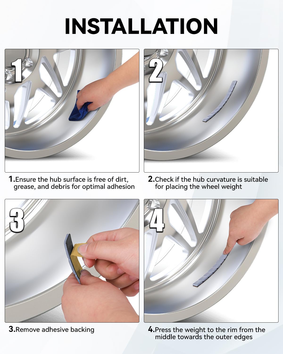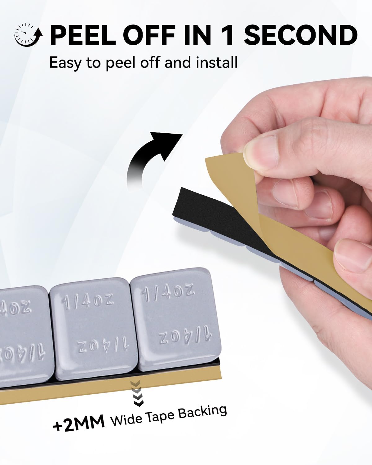 - Peel Off in 1 Second: Features a 2mm extended design, easy to peel backing makes adhering the weight to the tire simple and efficient, and it is flexible enough to fit any wheel shape and size