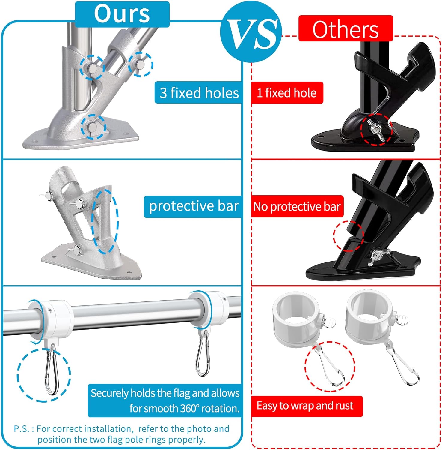 - Unique Bracket: The high strength aluminum alloy flag pole holder for outside house has been upgraded with unique protective bar and 3 fixed holes to make the two-position (90Β° and 45Β°) flagpole more stable
