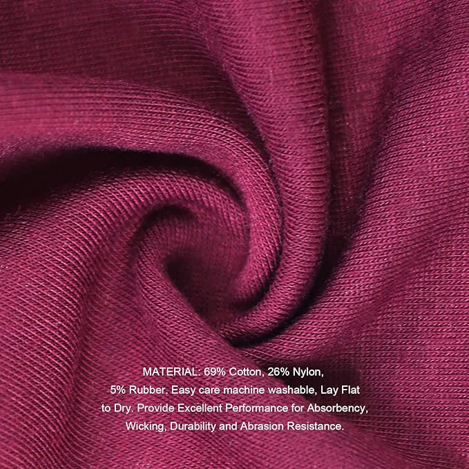 - MATERIAL: 69% Cotton, 26% Nylon, 5% Rubber. Easy care machine washable, Lay Flat to Dry. Provide Excellent Performance for Absorbency, Wicking, Durability and Abrasion Resistance.