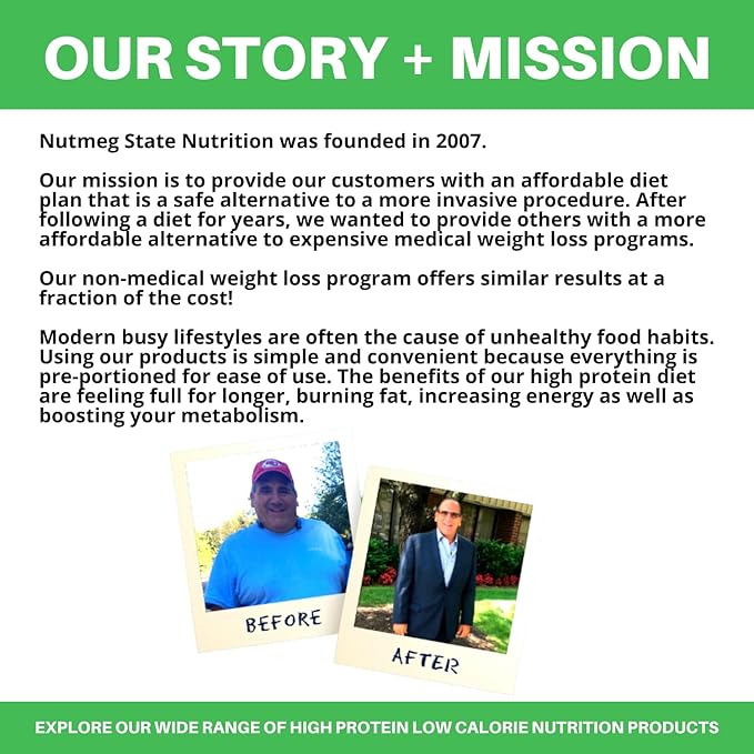 - EASY DIETING WITH NUTMEG STATE NUTRITION: Create your own diet regime with our delicious range of drinks, shakes, breakfasts, entrees, supplements, soups and more.