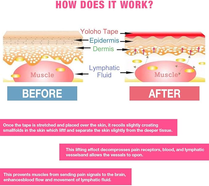 - [BETTER TRAINNING PERFORMANCE]- Kinesiology Tapes improve your workout by increasing the blood circulation, providing fast and effective pain suppression and relief, joint protection, fatigue reduction and support for muscles, ligaments and tendons aches and injuries.