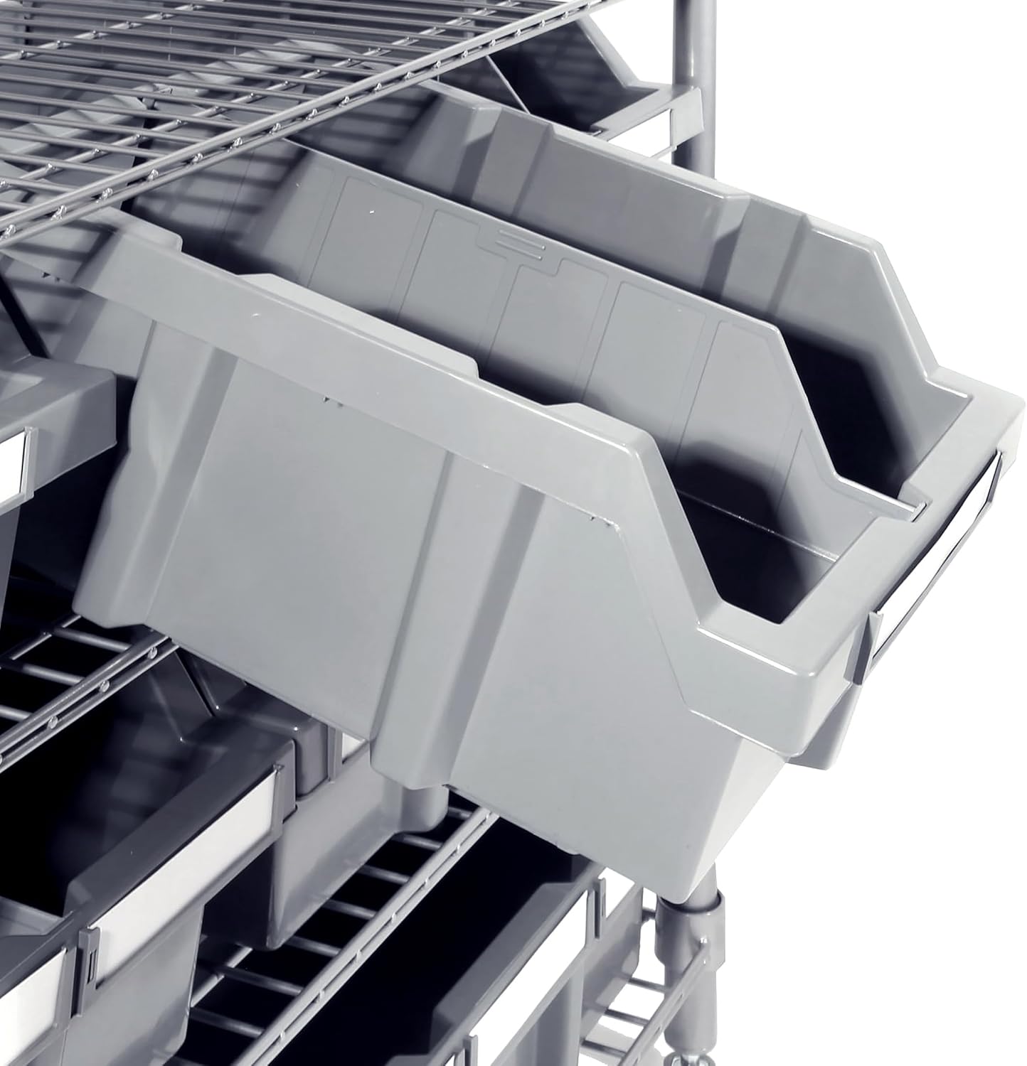 - 16 BINS — 16 removeable high-impact polypropylene (HIPP) gray bins: 4 X-Large (16” W x 14” D x 7” H) and 12 Large (10.5” W x 14” D x 7” H); Plus 20 bin dividers and 30 bin labels.