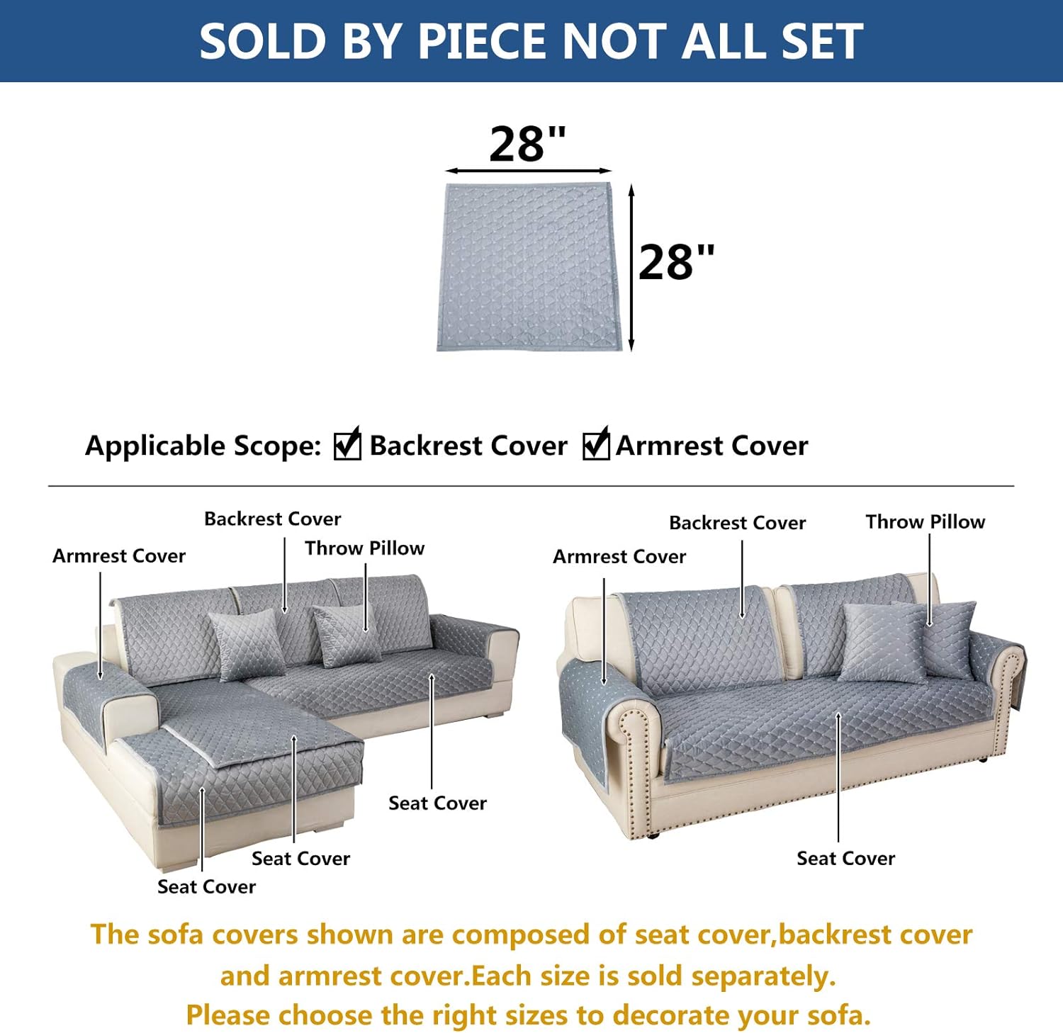 Eismodra Armrest Covers,Couch Cover,Sofa Cover,Backrest Covers,Anti-Slip Armchair Slipcovers for Dogs Cats Pet Loveseat Recliner Leather L Shaped,Light Gray 28 x 28 Inches (Only 1 Piece)
