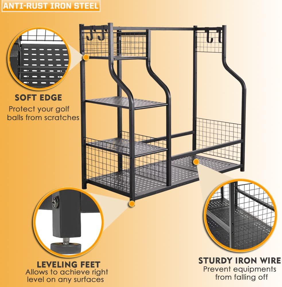 - 【EASY INSTALLTION WITH ADJUSTABLE FEET DESIGN】- With well-written assembly instruction, the well packed golf bag storage rack could be easily and quickly installed ONLY with a Philips head screw driver in your toolbox storage case. Besides, the adjustable leveling feet could help the rack stand straight on whatever surface while a set of screws in the package could help the stand be fixed onto the wall if you want it more stable