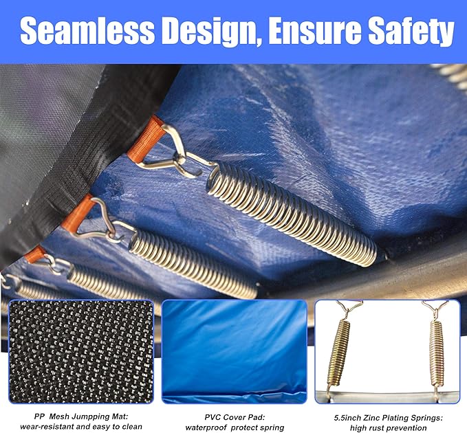 - 👉【ASTM Approved】 Our trampoline has passed ASTM Approved by Amazon! Seamless design, high safety, long service life, good after-sales service! Note: When using it, it should be placed on a flat ground to avoid uneven force due to uneven ground.