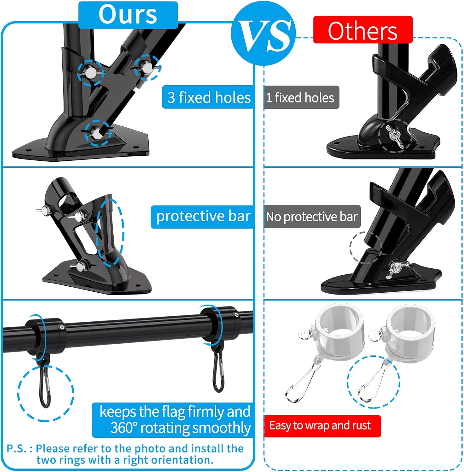 - Exquisite Design: 1*Flag Pole Diameter 1'', 1*Upgraded Bracket, 2*New Tangle Free Rings, 4*Carabiners, 1*Top Ball, 1*Installation Manual