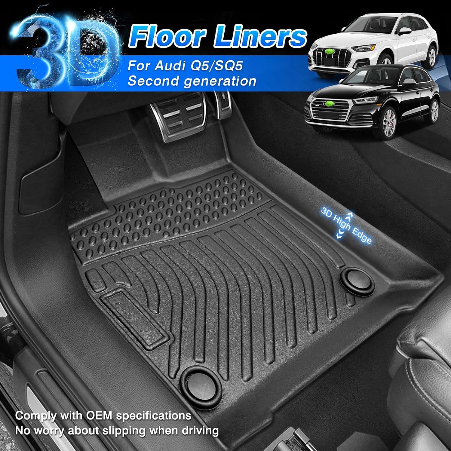 - Custom Fit for Audi Q5 / SQ5 -- The floor mats are designed for 2018 2019 2020 2021 2022 2023 2024 Audi Q5 / SQ5 5 passengers, based on correct vehicle information, no need trimming. Adopts 3D screening technology to capture every corner and crevice to offer perfect fit and coverage.