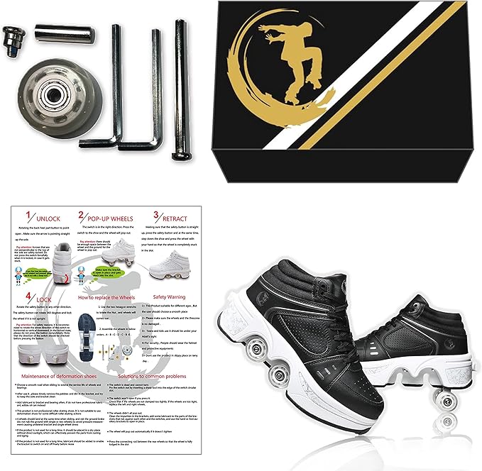 - Smooth Rolling: When it's time to skate, simply pop out the retractable wheels, and you're ready to roll! The smooth-rolling wheels offer a stable and enjoyable skating experience, whether you're a beginner. No need for any tools or complicated mechanisms. Converting the sneakers into roller skates is as easy as 1-2-3, making it suitable for all ages and fun for teenager and adults, too.