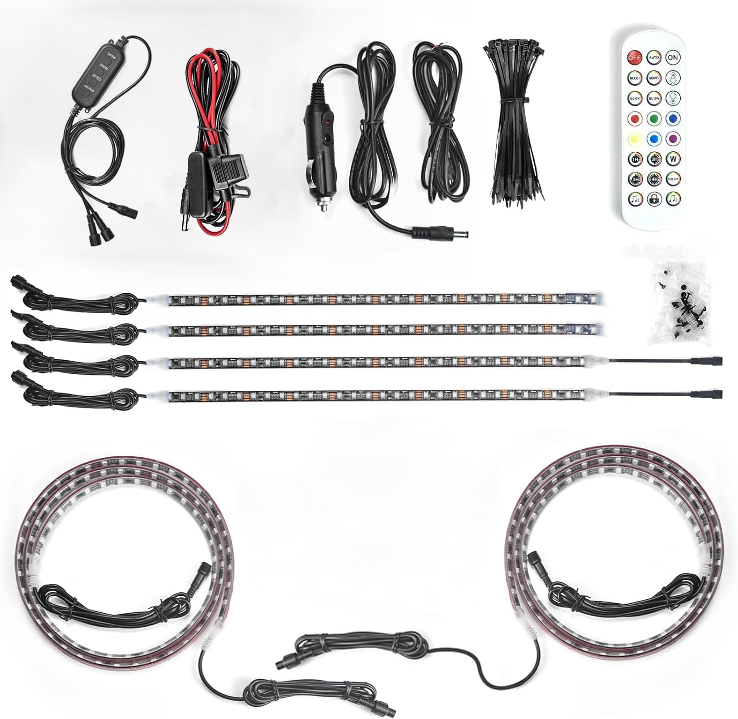 - Included Components : 1 x Car Underglow light kit, 1 x Remote Control, 1 x Control Instruction, Ties & Fixing Clips & Screws 1 x Car Underglow light kit, 1 x Remote Control, 1 x Control Instruction, Ties & Fixing Clips & Screws