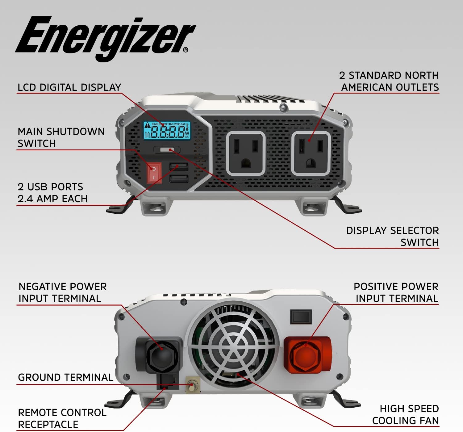 - ENERGIZER POWER INVERTER - 1100 watt continuous power, 2200 watts peak power. Features 2 USB ports (2.4Amps Each), 2 Standard North American AC outlets (each rated at 15Amps). Free 3FT 4AWG battery cables included.