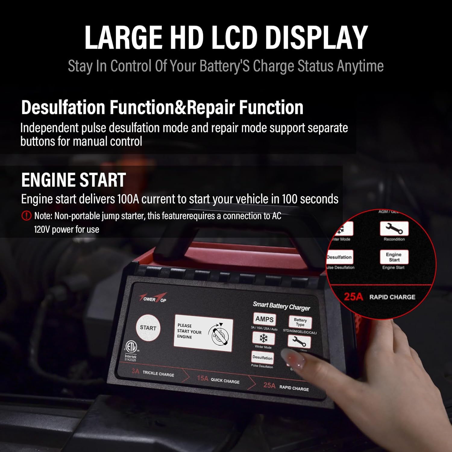 - Engine Start & Winter Mode: Engine start delivers 100A current helps activating your car battery to start your vehicle in 100 seconds. Winter Mode, +0.2v on the basis of the original charging voltage, better boosts your battery activity and charges more thoroughly in low-temperature situations