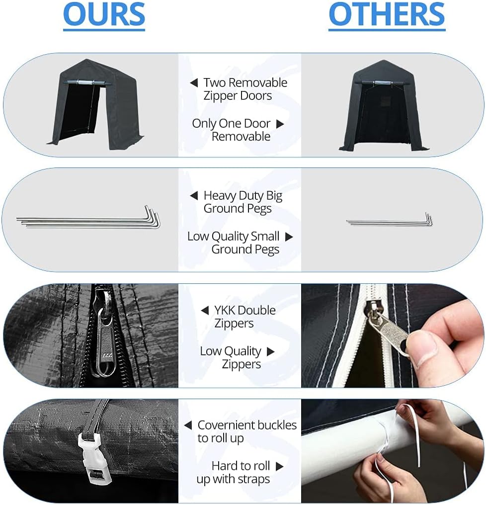 - 【Various Use】✔The portable storage shelter can be a motorcycle storage shelter, ATV storage shed, bike storage tent, or small vehicle garage shelter. It is also suitable for small lawnmowers, firewood or any other gardening tools.