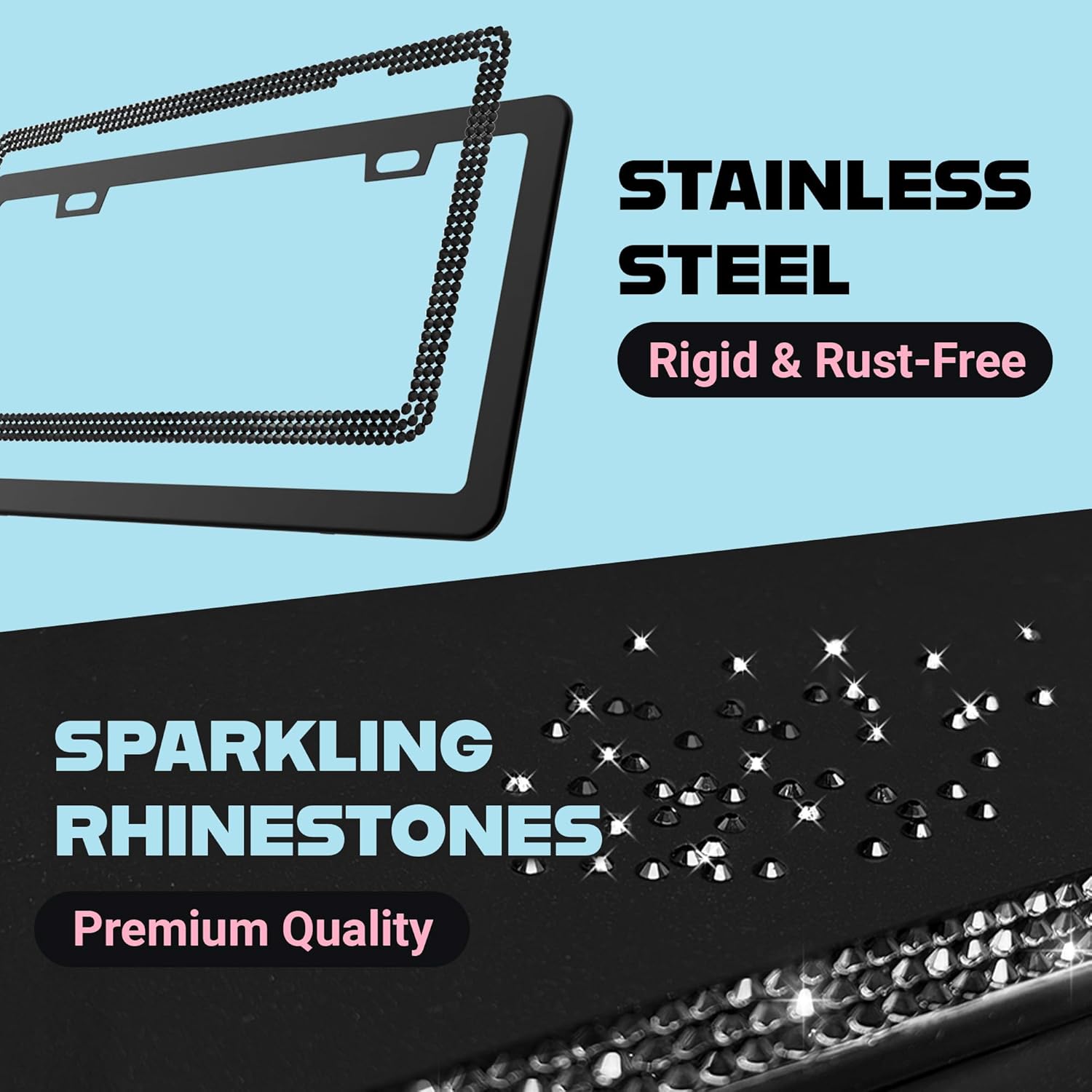 - Black Rhinestone Bling License Plate Frame for Women: Add a girly, glittery touch to your ride with this stunning 1-pack that’s made to shine.