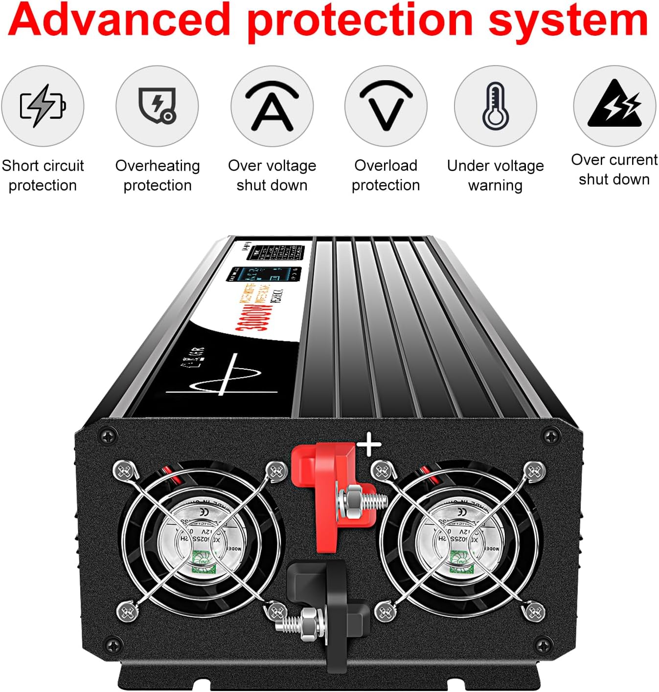 - Transfer 12VDC to 120VAC, DC range(10V-15V ) 60Hz frequency, Intelligent temperature control cooling fan. Earth connection for both PCB board and output. Digital LCD display.