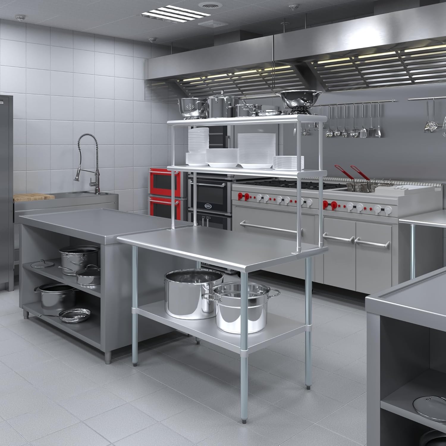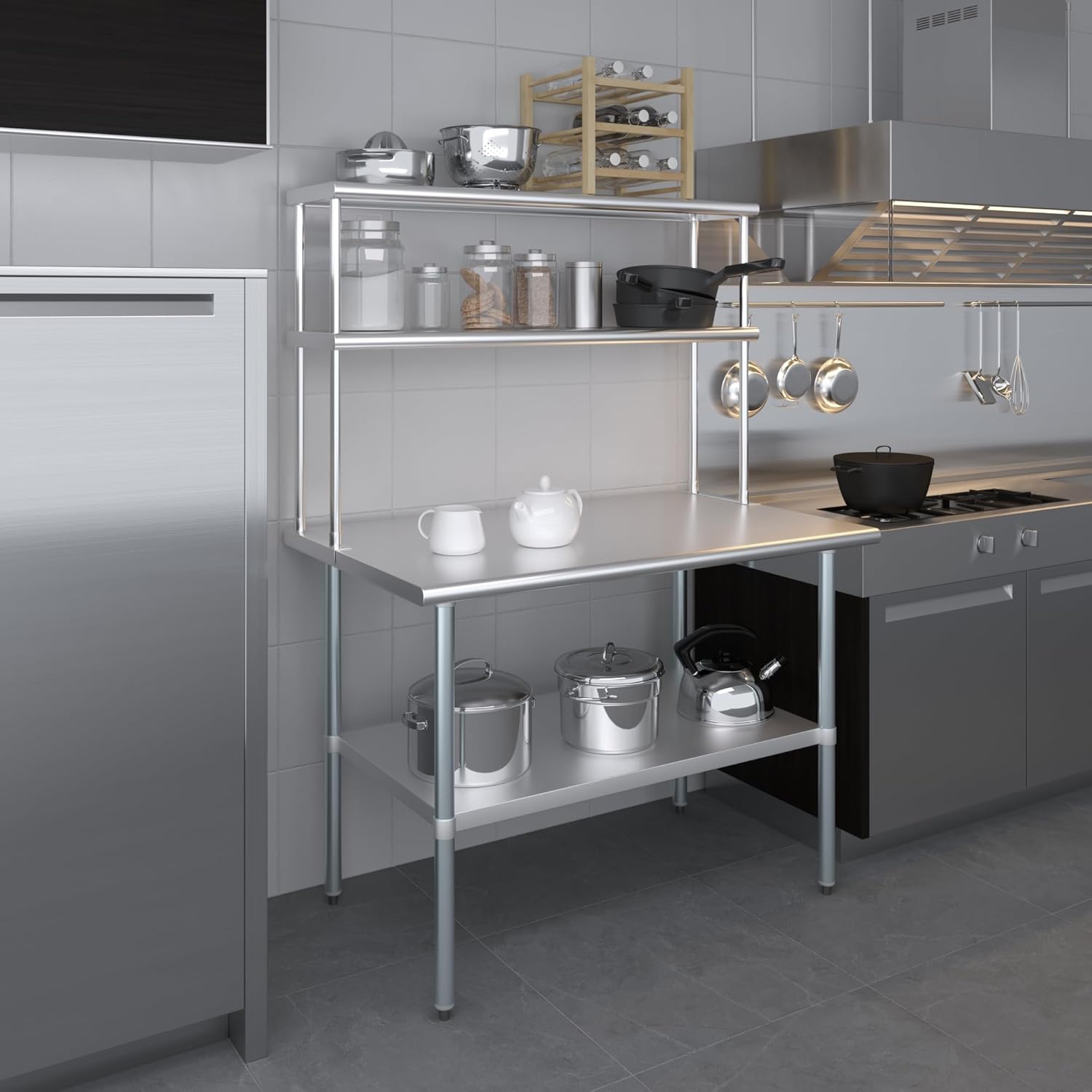 - WORK SAFETY: Work table top and double tier adjustable shelves are constructed from 18-gauge stainless steel, making this restaurant prep and serve table and double tier shelf combo set is durable and long lasting. The table top comes with a galvanized under-shelf for additional storage and adjustable legs for convenience. This table and shelf set is specifically designed and finished for use in a commercial or industrial setting, but is just as reliable in the home.