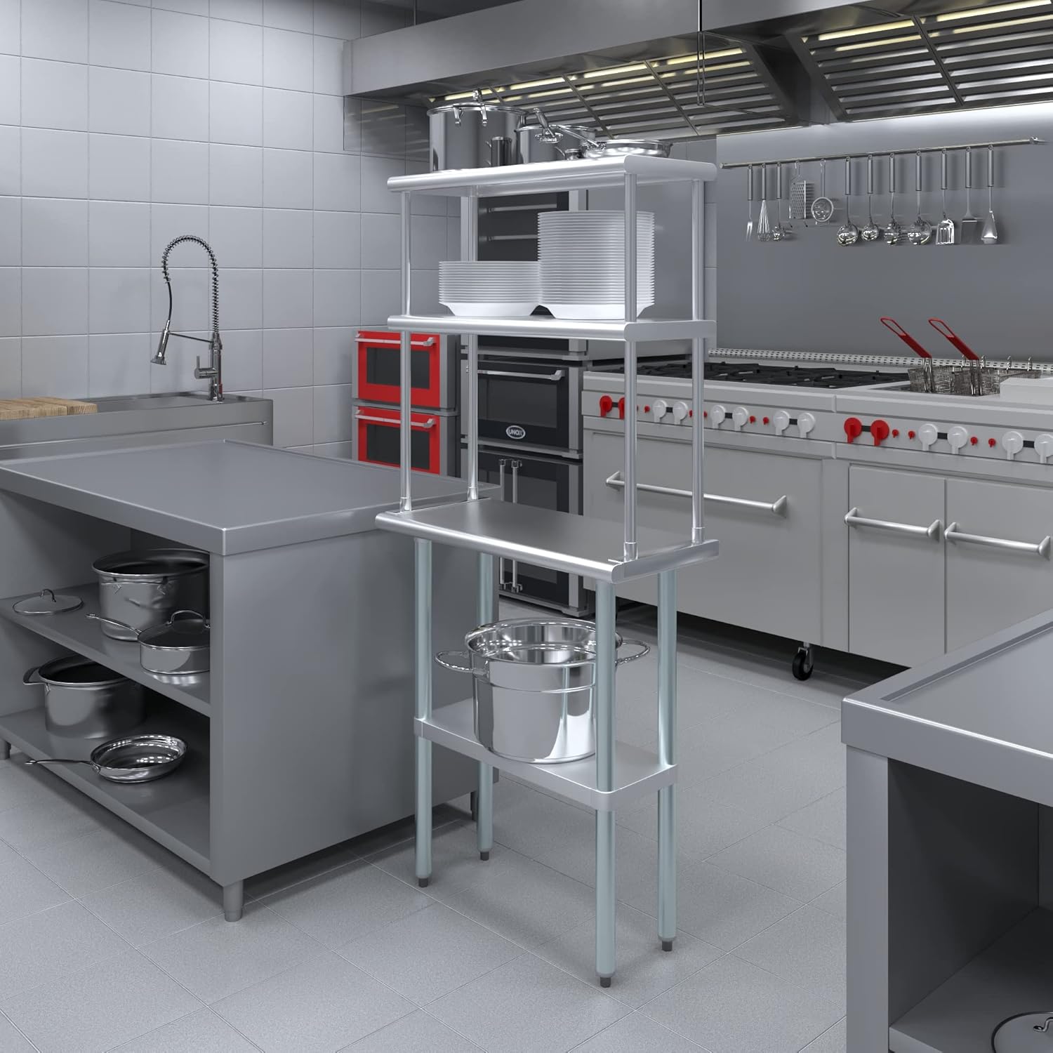 - WORK SAFETY: Work table top and double tier adjustable shelves are constructed from 18-gauge stainless steel, making this restaurant prep and serve table and double tier shelf combo set is durable and long lasting. The table top comes with a galvanized under-shelf for additional storage and adjustable legs for convenience. This table and shelf set is specifically designed and finished for use in a commercial or industrial setting, but is just as reliable in the home.