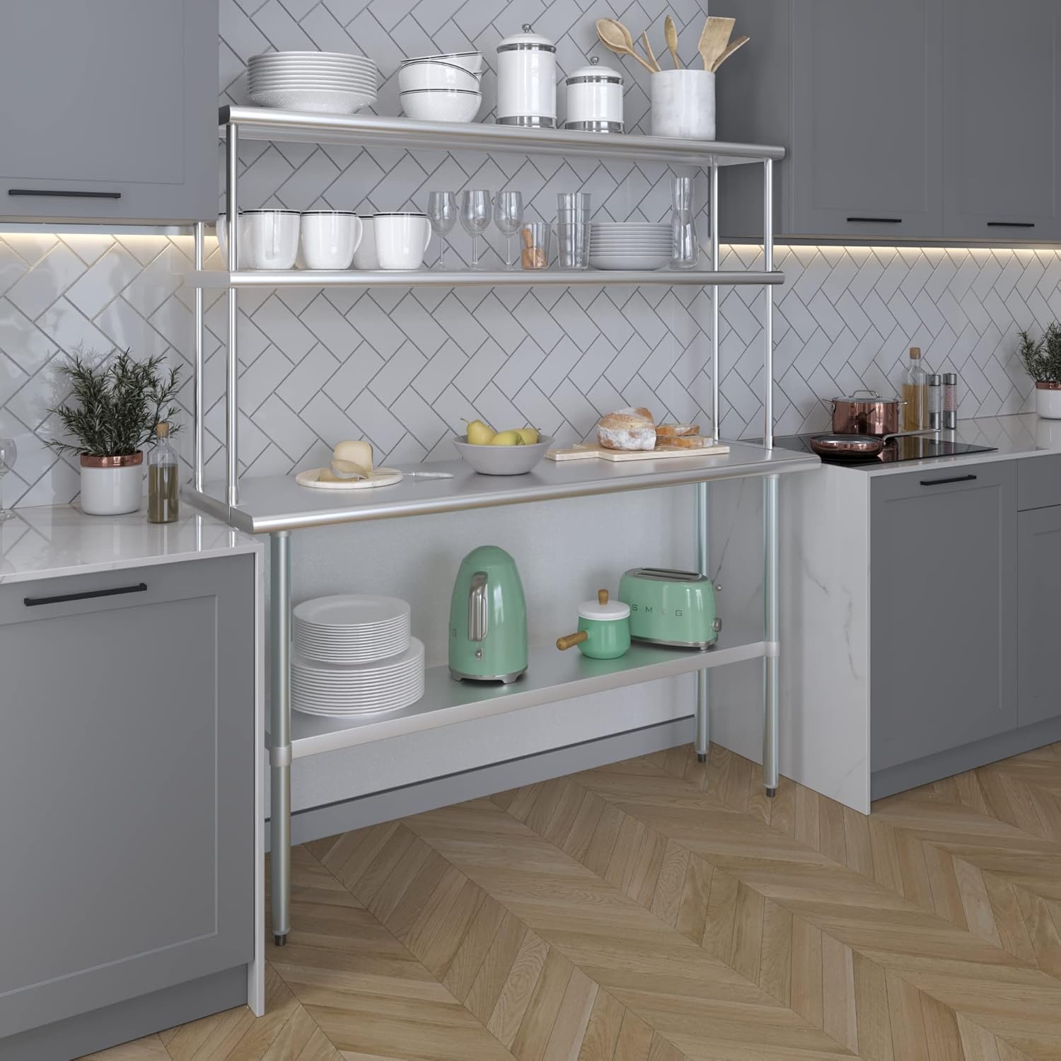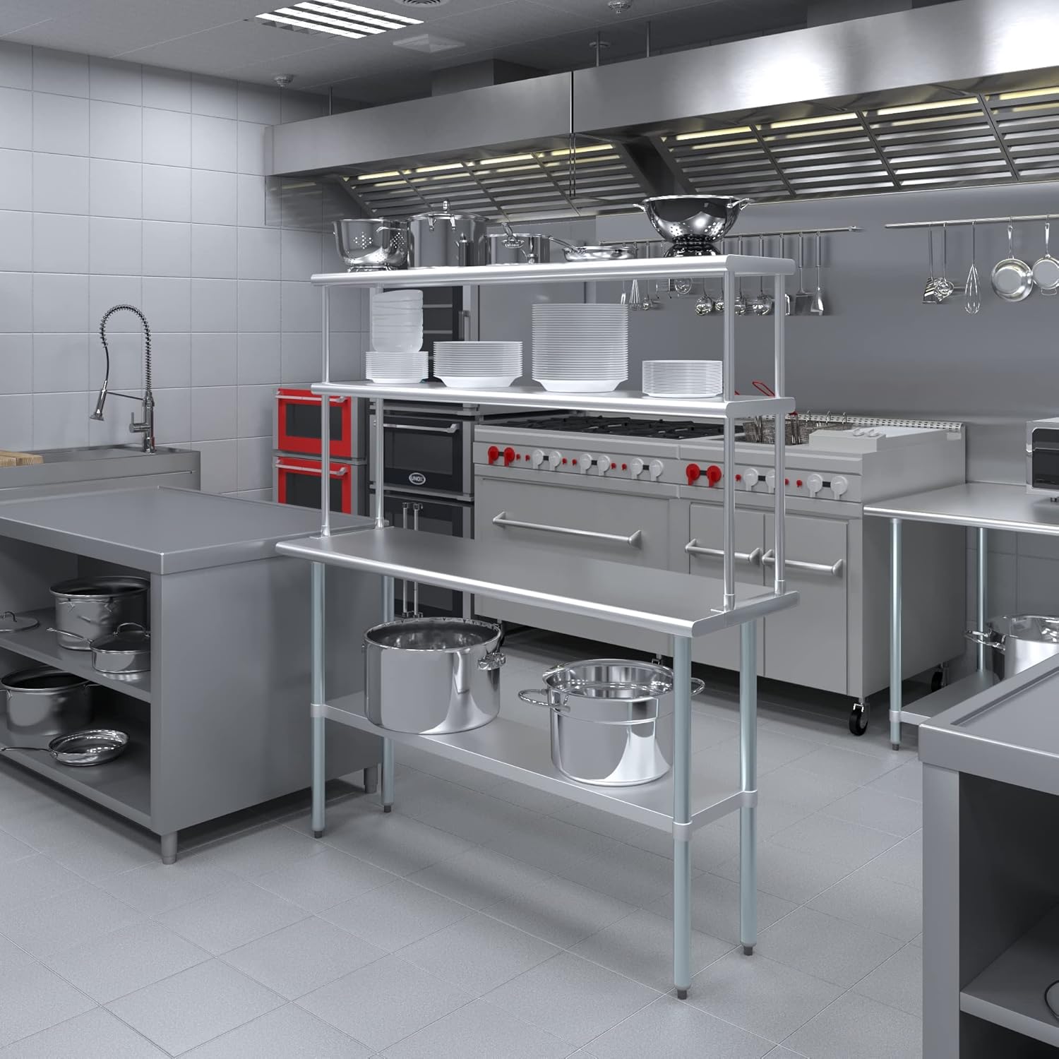 - WORK SAFETY: Work table top and double tier adjustable shelves are constructed from 18-gauge stainless steel, making this restaurant prep and serve table and double tier shelf combo set is durable and long lasting. The table top comes with a galvanized under-shelf for additional storage and adjustable legs for convenience. This table and shelf set is specifically designed and finished for use in a commercial or industrial setting, but is just as reliable in the home.