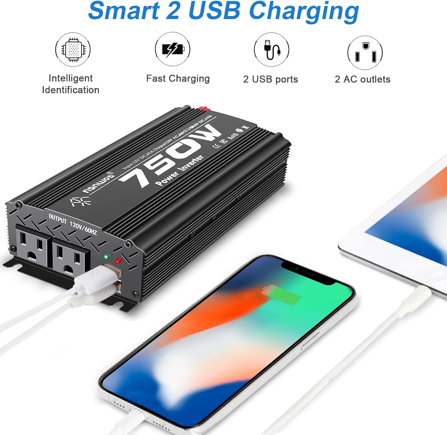 12V to 110V Inverter - 750W Car Inverter with 2 AC Outlets & 2 USB Ports for Trucks & Various Vehicles