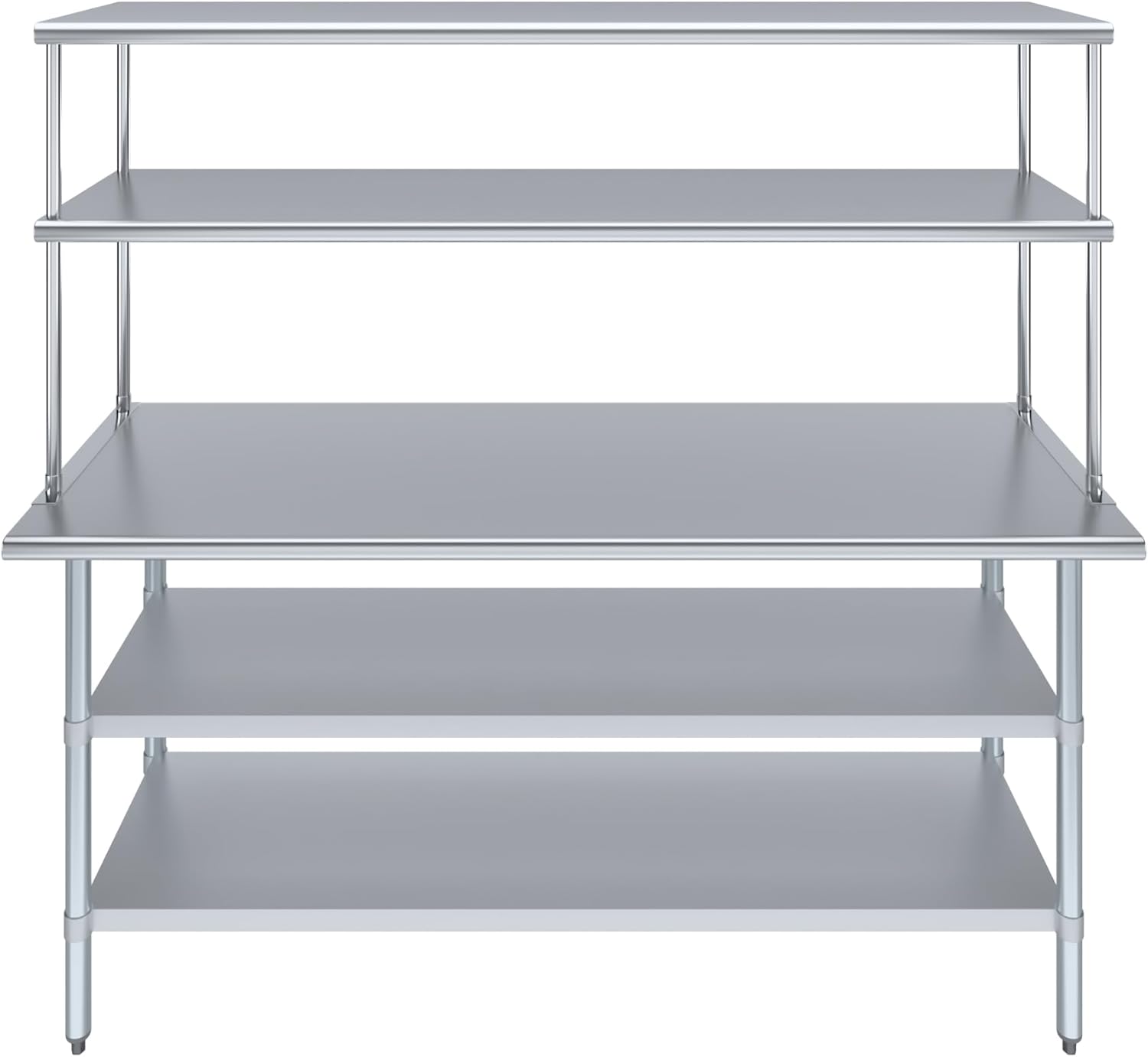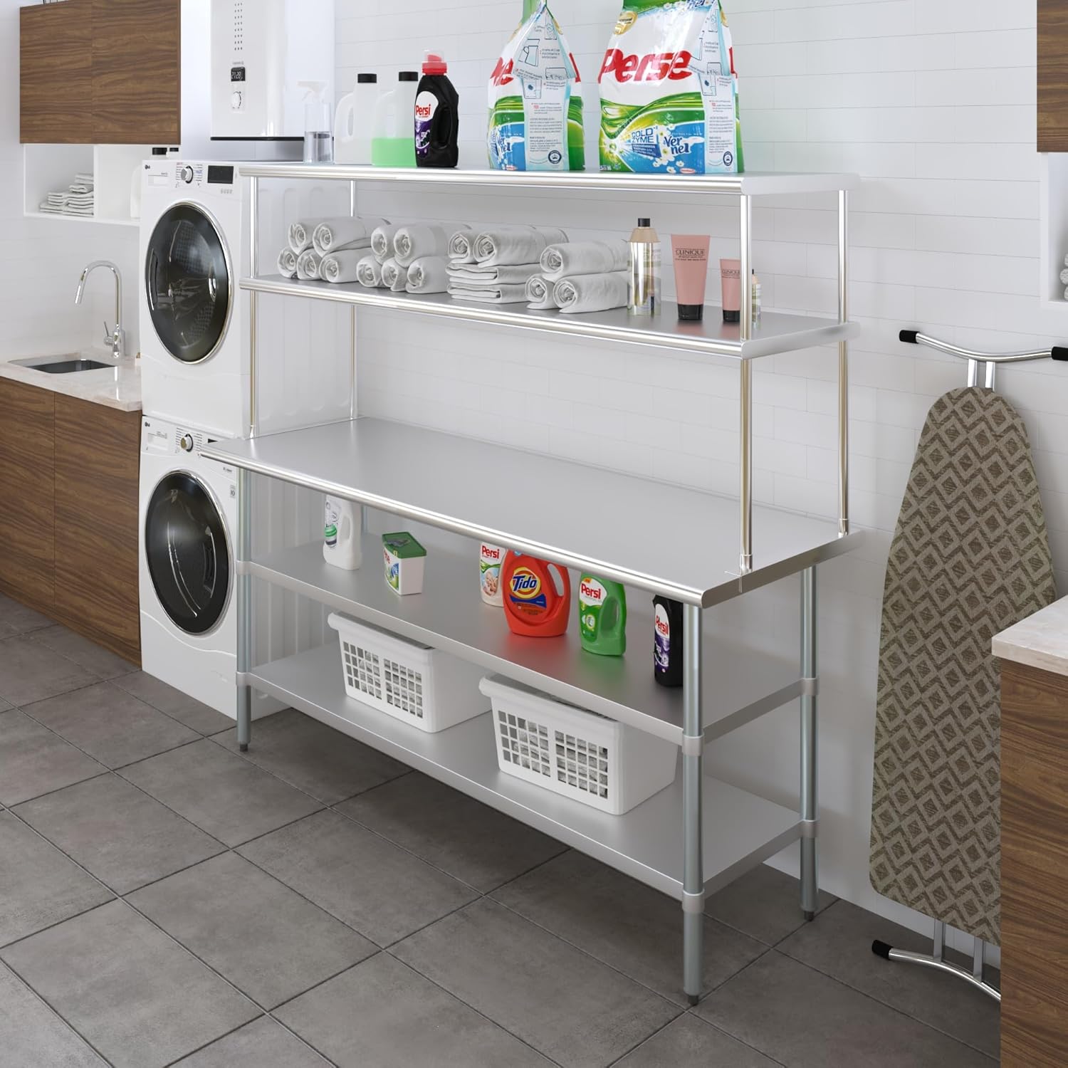 - WORK SAFETY: Work table top and double tier adjustable shelves are constructed from 18-gauge stainless steel, making this restaurant prep and serve table and double tier shelf combo set is durable and long lasting. The table top comes with a galvanized under-shelf for additional storage and adjustable legs for convenience. This table and shelf set is specifically designed and finished for use in a commercial or industrial setting, but is just as reliable in the home.