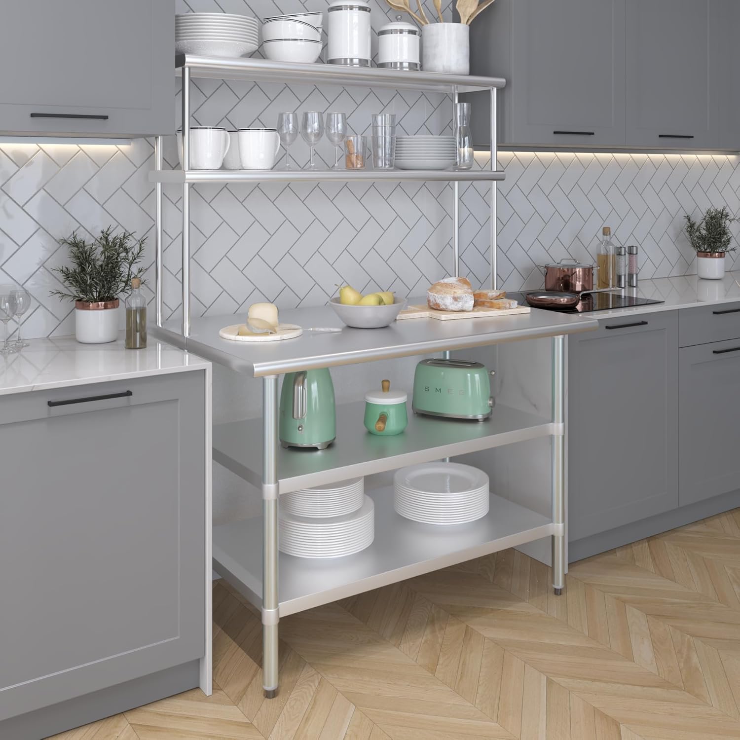- WORK SAFETY: Work table top and double tier adjustable shelves are constructed from 18-gauge stainless steel, making this restaurant prep and serve table and double tier shelf combo set is durable and long lasting. The table top comes with a galvanized under-shelf for additional storage and adjustable legs for convenience. This table and shelf set is specifically designed and finished for use in a commercial or industrial setting, but is just as reliable in the home.